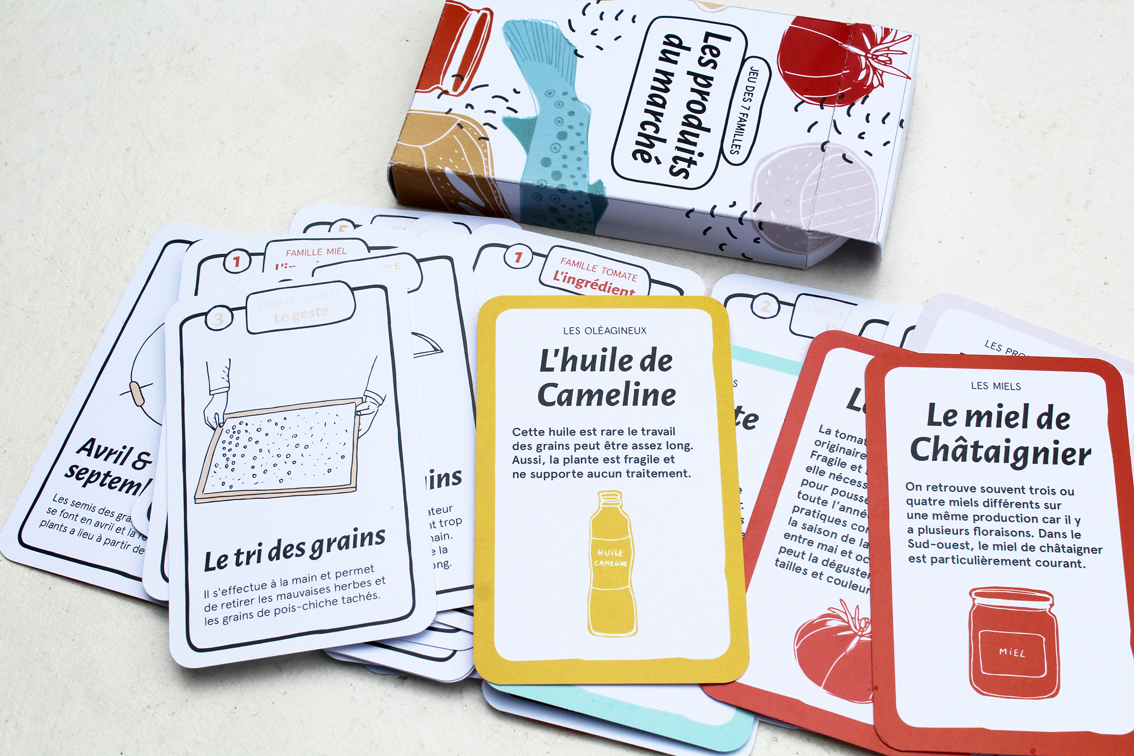 Les 7 produits du marché is a card game whose principle is taken from the game of the 7 families. It highlights products from the market (among seven food families: cereals, meat or fish, fruit or vegetable, dairy product, honey, oilseeds, legumes). The aim is to show the different elements of production in organic and peasant agriculture : each family has six maps that show and describe a parameter that goes into the production of the food (a gesture, a place, a tool, an ingredient/ basic raw product, a trade, a temporality). The game becomes a medium of information to raise awareness about production practices and can be used by producers in the market.