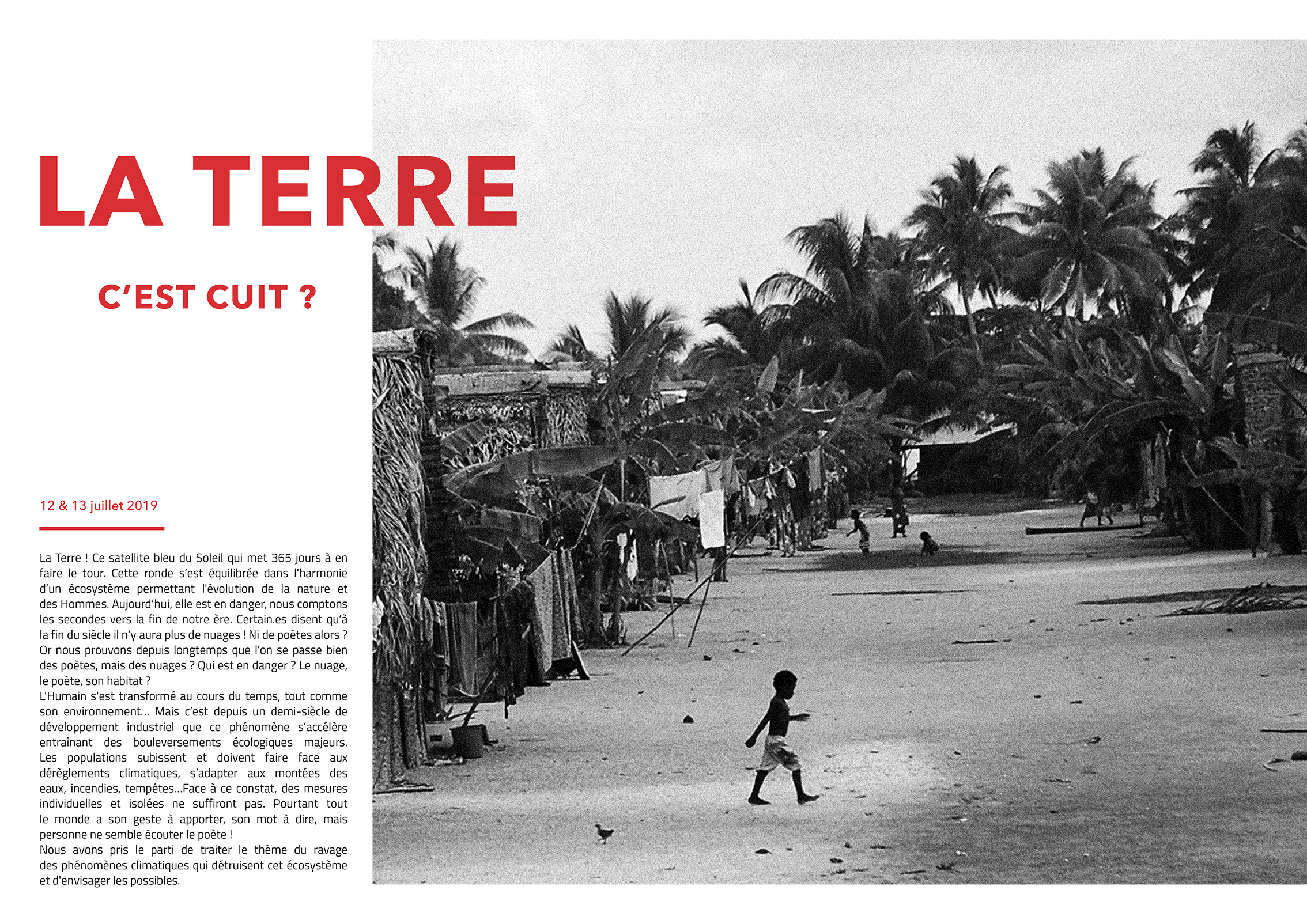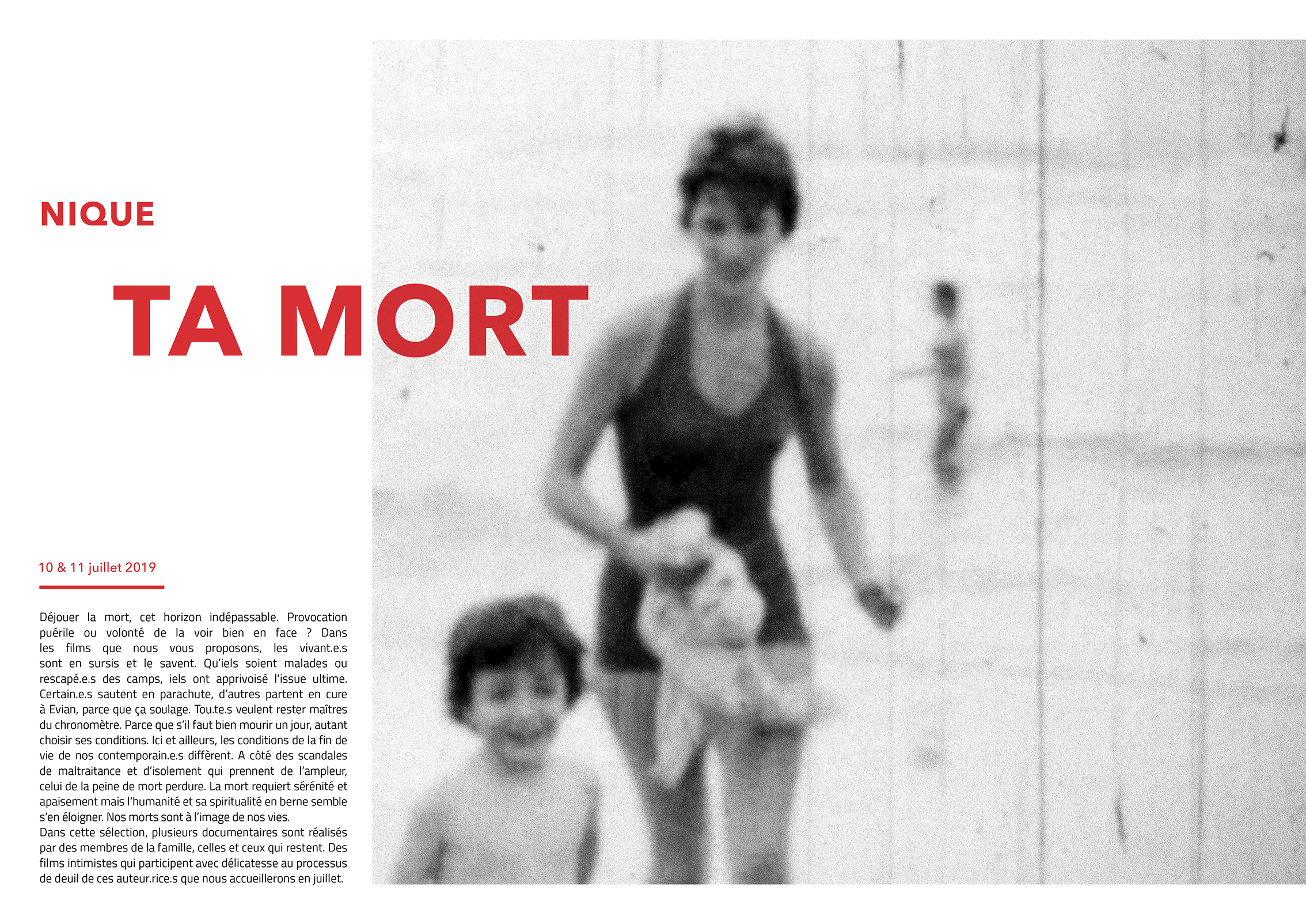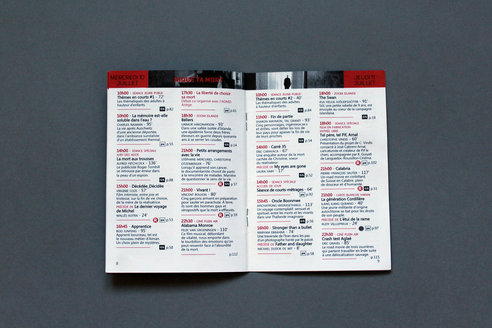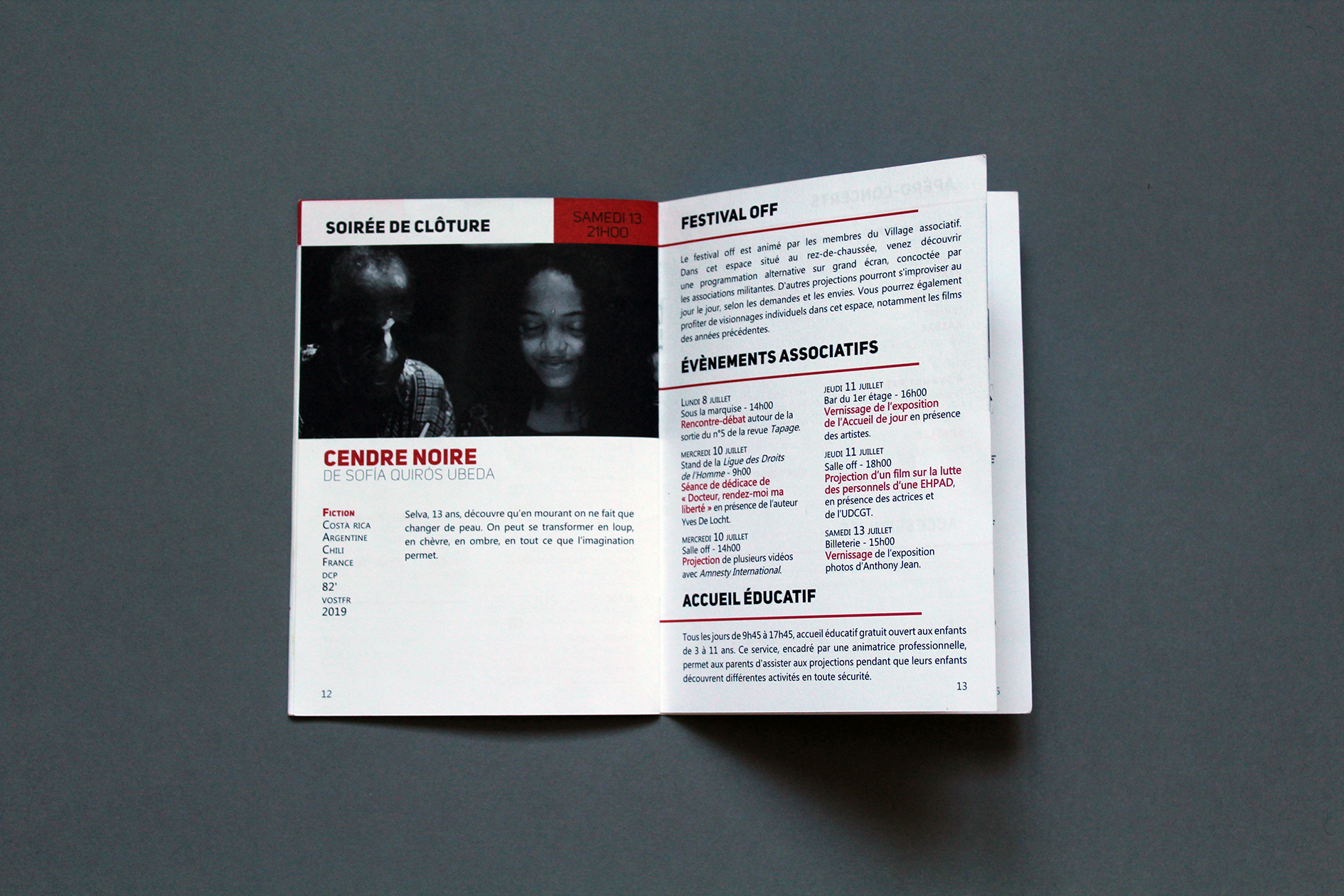 à partir d’une identité graphique déjà établie (affiche édition 2019, logo, couleurs). Ici, pages de présentation des thèmes extraites du dossier de presse, affiches du cinéma plein-air, programme horaires du festival, carte postale et programme jeune public.